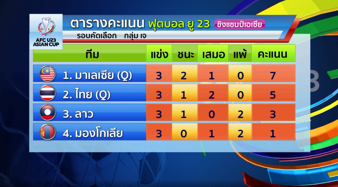 ฟุตบอลชิงแชมป์เอเชีย รุ่นอายุไม่เกิน 23 ปี รอบคัดเลือก กลุ่มเจ นัดที่ 3 ที่สนามเอ็มเอฟเอฟ ฟุตบอล เซนเตอร์ กรุงอูลานบาตอร์ ประเทศมองโกเลีย ทีมชาติไทย ที่อยู่อันดับ 2 มี 4 คะแนน พบ มาเลเซีย ทีมจ่าฝูงที่มี 6 คะแนน เกมนี้ทีมไทยต้องชนะสถานเดียวเพื่อเป็นแชมป์กลุ่ม ส่วนมาเลเซียเล่นเพียงแค่เสมอก็เป็นแชมป์กลุ่ม ตลอด 90 นาที ทีมไทย กับ มาเลเซีย ไม่สามารถทำอะไรกันได้เสมอกัน 0-0 ทำให้ทีมไทย แข่ง 3 นัด ชนะ 1 เสมอ 2 มี 5 คะแนน เป็นอันดับ 2 ของกลุ่ม ส่วนมาเลเซีย ชนะ 2 เสมอ 1 มี 7 คะแนน เป็นแชมป์กลุ่มผ่านเข้ารอบสุดท้ายไปแข่งที่ประเทศอุซเบกิสถานแน่นอน ส่วนทีมไทยต้องลุ้นเป็นอันดับ 2 ที่ดีที่สุดเป็น 1 ใน 4 ทีม จาก 10 กลุ่มต่อไป และต้องลุ้นให้ ลาว ชนะ มองโกเลีย เพื่อไม่ให้ทีมไทยโดนตัด 3 คะแนนจากการชนะลาวเนื่องจากบางกลุ่มมี 3 ทีมต้องตัดคะแนนจากทีมท้ายตารางคะแนน ปรากฏว่าลาว เอาชนะ มองโกเลีย 3-2