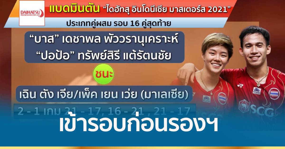 ผลการแข่งขันแบดมินตัน รายการ “ไดฮัทสุ อินโดนีเซีย มาสเตอร์ส 2021” ทัวร์นาเมนต์ระดับเวิลด์ทัวร์ 750 ที่เกาะบาหลี ประเทศอินโดนีเซีย รอบ 16 คู่สุดท้าย ประเภทคู่ผสม “บาส” เดชาพล พัววรานุเคราะห์ กับ ”ปอป้อ” ทรัพย์สิรี แต้รัตนชัย คู่มือวาง 1 ของรายการ และคู่มือ 2 ของโลก เอาชนะ เฉิน ตัง เจีย กับ เพ็ค เยน เว่ย คู่มือ 45 ของโลกจากมาเลเซีย 2-1 เกม 21-17, 16-21, 21-17 ใช้เวลาแข่งขัน 1 ชั่วโมง ผ่านเข้าก่อนรอบรองชนะเลิศ ไปพบกับ ฮู ปัง รอน กับ เซียะ ยี่ ซี คู่มือ 25 ของโลกจากมาเลเซีย