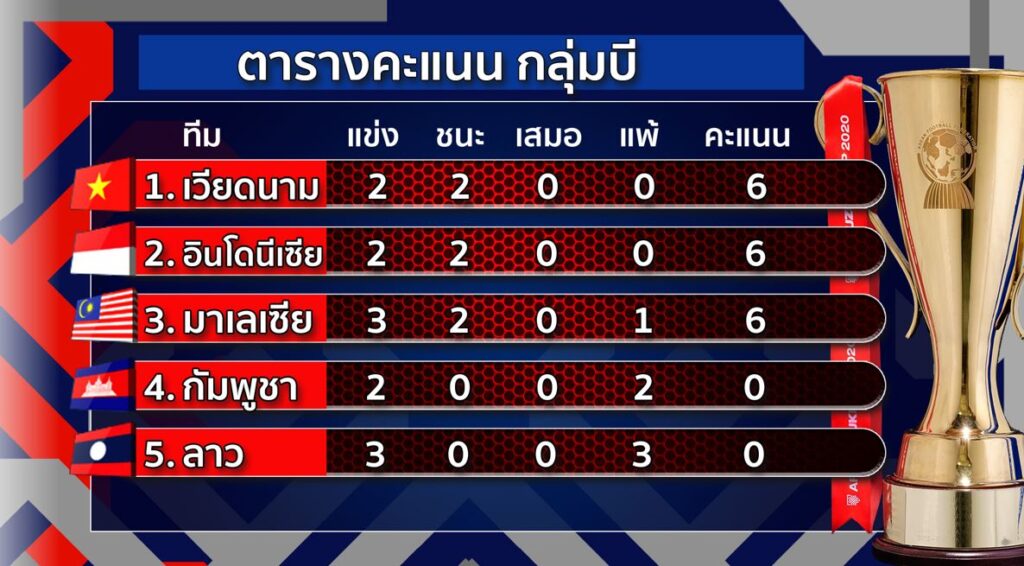 ฟุตบอลชิงแชมป์อาเซียน เอเอฟเอฟ ซูซูกิ คัพ 2020 รอบแบ่งกลุ่ม กลุ่มบี ที่สนามบิซาน สเตเดี้ยม ประเทศสิงคโปร์ แชมป์เก่า ทีมชาติเวียดนาม ชุดสีแดง ถล่มชนะ ทีมชาติมาเลเซีย รองแชมป์เก่า 3-0 ได้ประตูจาก เหงียน กวง ไฮ นาทีที่ 32, เหงียน คอง เฟือง กองหน้าจากฮองอันห์ ยาลาย นาทีที่ 36 และ เหงียน ฮหว่าง ดึ๊ก นาทีที่ 89 จบเกมเวียดนาม เก็บชัยชนะ 2 เกมรวด มีเพิ่มเป็น 6 แต้ม ส่วนมาเลเซีย ลงสนาม 3 นัด มี 6 แต้มเท่าเดิม