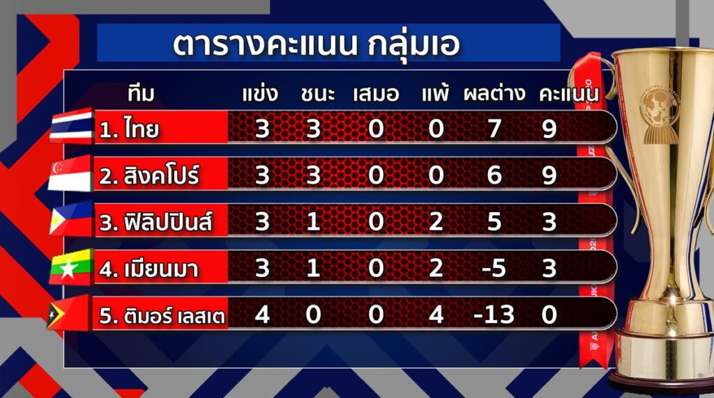 สำหรับทีมชาติไทยจะพบกับเจ้าภาพ สิงคโปร์ เพื่อตัดสินแชมป์กลุ่ม ในวันเสาร์ที่ 18 ธ.ค.นี้ ที่สนามกีฬาแห่งชาติสิงคโปร์ เวลา 19.30 น. ตามเวลาประเทศไทย ส่วนอีกคู่ เมียนมา พบ ฟิลิปปินส์. – สำนักข่าวไทย