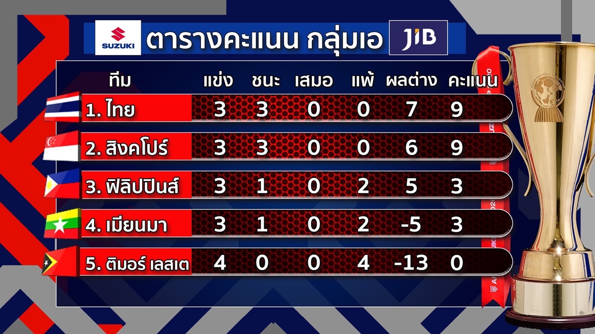 สำหรับสถานการณ์ทีมชาติไทย ผ่านเข้ารอบรองชนะเลิศเรียบร้อยแล้ว จากการชนะ 3 นัดรวด มี 9 คะแนนเต็ม เท่ากับ สิงคโปร์ แต่ผลต่างประตูได้เสียดีกว่า โดยนัดสุดท้าย ขอแค่ผลเสมอก็จะคว้าแชมป์กลุ่มเอทันที
