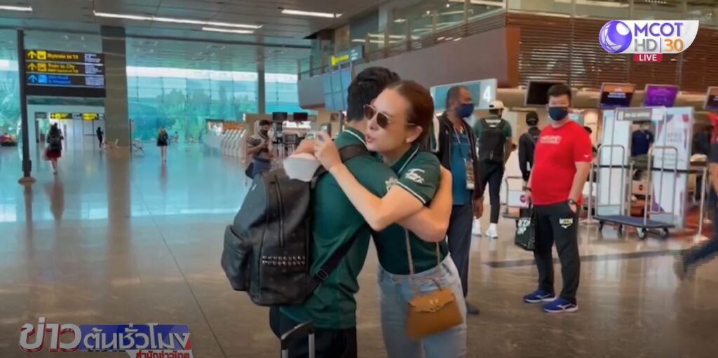 นี่เป็นภาพขณะ “มาดามแป้ง” นวลพรรณ ล่ำซำ ผู้จัดการทีมชาติไทย ได้อวยพร “กัน” ธนวัฒน์ ซึ้งจิตถาวร กองกลางจากเลสเตอร์ ซิตี้ ที่มาร่วมสู้ศึกกับทีมชาติไทย จนคว้าแชมป์อาเซียน “เอเอฟเอฟ ซูซูกิ คัพ 2020” สมัยที่ 6 ที่ประเทศสิงคโปร์ ให้เดินทางกลับบ้านอย่างปลอดภัย พร้อมขอบคุณที่เต็มที่เพื่อทีมชาติไทยทุกครั้ง โดยดาวเตะวัย 21 ปี ได้แยกเดินทางกลับไปยังแฟรงก์เฟิร์ต ประเทศเยอรมนี หลังเสร็จสิ้นภารกิจ