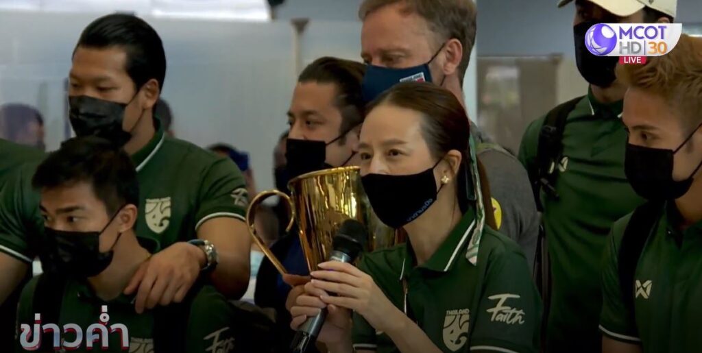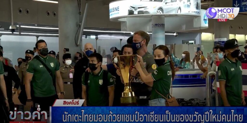 2 ม.ค. – นักเตะทีมชาติไทยชุดแชมป์อาเซียน 2020 เดินทางกลับถึงประเทศไทยแล้ว ยอดเงินอัดฉีดแชมป์ลุ้นทะลุถึง 50 ล้านบาท “มาดามแป้ง” ขอบคุณแฟนบอลที่มาต้อนรับ และแชมป์นี้ถือเป็นของขวัญปีใหม่ให้คนไทยทุกคน ขณะที่ “เจ” ชนาธิป ลั่นพร้อมพาทีมไปไกลระดับโลก