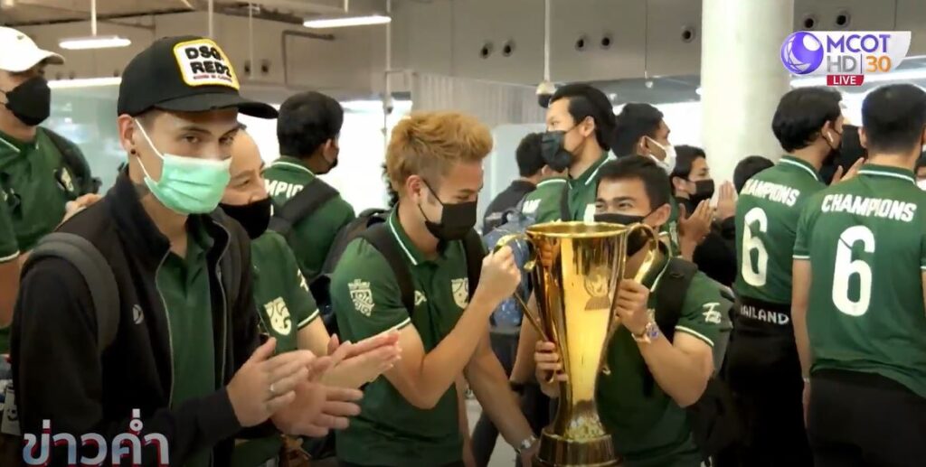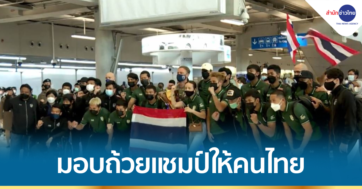“ทัพนักเตะช้างศึก” ทีมชาติไทย ชุดแชมป์ฟุตบอลชิงแชมป์อาเซียน “เอเอฟเอฟ ซูซูกิ คัพ สมัยที่ 6” นำโดย “กัปตันเจ” ชนาธิป สรงกระสินธ์ เจ้าของตำแหน่งนักเตะยอดเยี่ยมประจำรายการ และ “มุ้ย” ธีรศิลป์ แดงดา ดาวซัลโวร่วม รวมถึง มาโน โพลกิ้ง หัวหน้าโค้ช และ “มาดามแป้ง” นวลพรรณ ล่ำซำ ผู้จัดการทีม เดินทางกลับถึงประเทศไทยแล้ว ที่สนามบินสุวรรณภูมิ เมื่อเวลาประมาณ 16.00 น. ท่ามกลางการต้อนรับจากแฟนบอล แต่ยังอยู่ภายใต้มาตรการป้องกันโควิด-19 กองเชียร์ไม่สามารถเดินเข้ามาใกล้นักเตะได้ โดยทีมชุดนี้ “บอย” ฉัตรชัย บุตรพรม ผู้รักษาประตูมือ 1 ที่ได้รับบาดเจ็บระหว่างเกมกับเวียดนาม ต้องนั่งรถวีลแชร์กลับมารักษาอาการเอ็นไขว้หน้าหัวเข่าซ้ายขาด ขณะที่ “กัน” ธนวัฒน์ ซึ้งจิตถาวร กองกลางจากเลสเตอร์ ซิตี้ ในพรีเมียร์ลีก ได้แยกเดินทางกลับไปยังแฟรงก์เฟิร์ต ประเทศเยอรมนี หลังเสร็จสิ้นภารกิจ