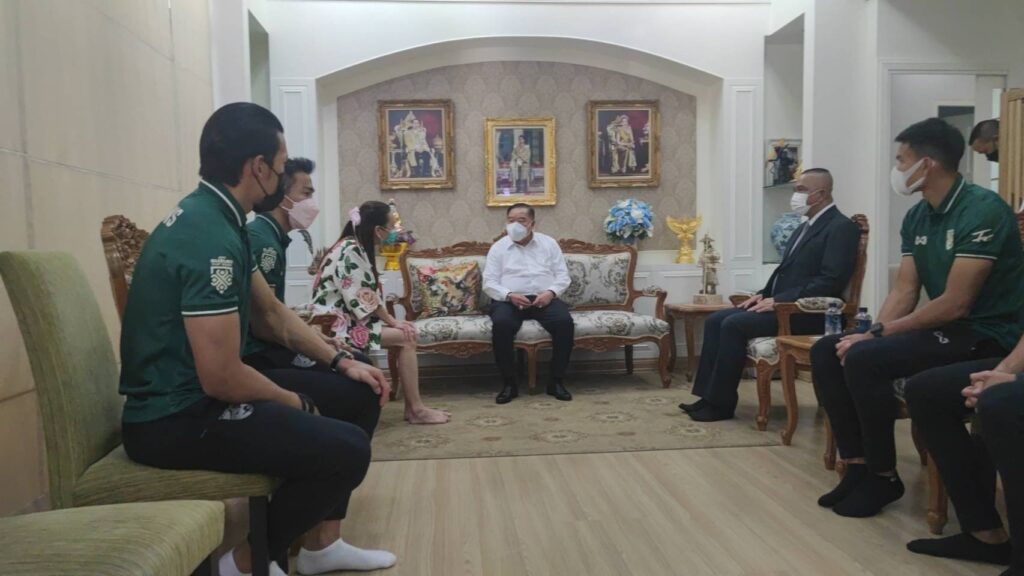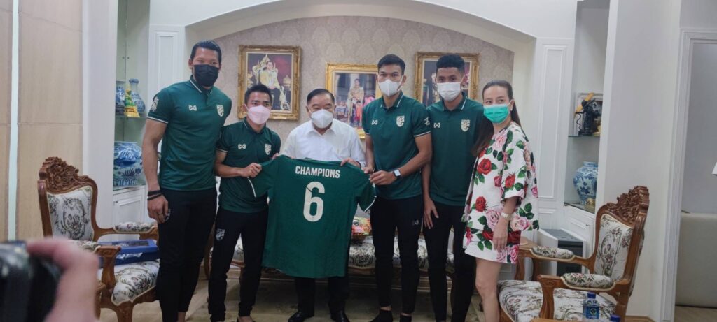 “มาดามแป้ง” นางนวลพรรณ ล่ำซำ ผู้จัดการฟุตบอลทีมชาติไทย “เมสซี่เจ” ชนาธิป สรงกระสินธุ์ กัปตันฟุตบอลทีมช้างศึก ผู้ฝึกสอน และคณะนักฟุตบอลทีมชาติไทย อาทิ กวินทร์ ธรรมสัจจานันท์ และบดินทร์ ผาลา เข้าเยี่ยมคารวะและขอบคุณ พล.อ.ประวิตร วงษ์สุวรรณ รองนายกรัฐมนตรี ในฐานะประธานโอลิมปิคแห่งประเทศไทยเนื่องในโอกาสปีใหม่ เพื่อขอบคุณที่ให้การสนับสนุนกีฬาฟุตบอลมาโดยตลอด ณ มูลนิธิป่ารอยต่อ 5 จังหวัด