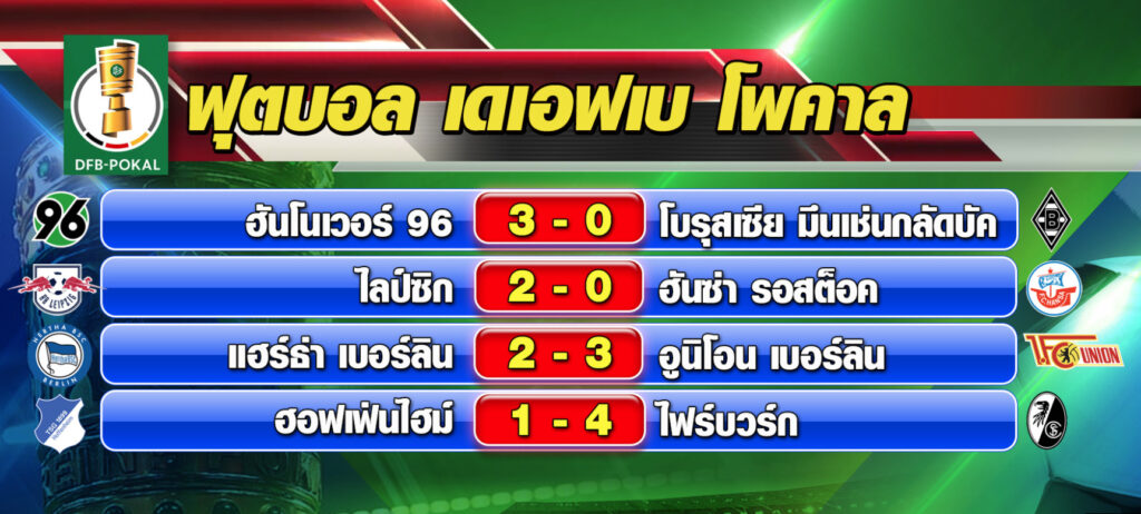 ผลคู่อื่น ฮันโนเวอร์ ชนะ กลัดบัค 3-0, แฮร์ธา เบอร์ลิน แพ้ อูนิโอน เบอร์ลิน 2-3 และไฟร์บวร์ก บุกไปชนะ ฮอฟเฟนไฮม์ 4-1. – สำนักข่าวไทย