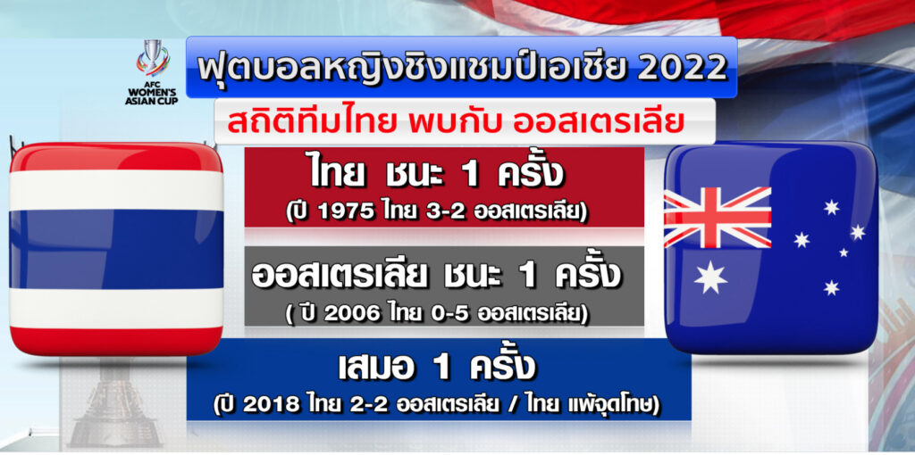 สถิติทีมไทยเคยพบกับออสเตรเลีย 3 ครั้งทีมไทย ชนะ 1 ครั้งในปี 1975 แพ้ 1 ครั้งใน ปี 2006 และเสมอ 1 ครั้ง ในปี 2018 ก่อนที่ไทยจะแพ้จุดโทษ
