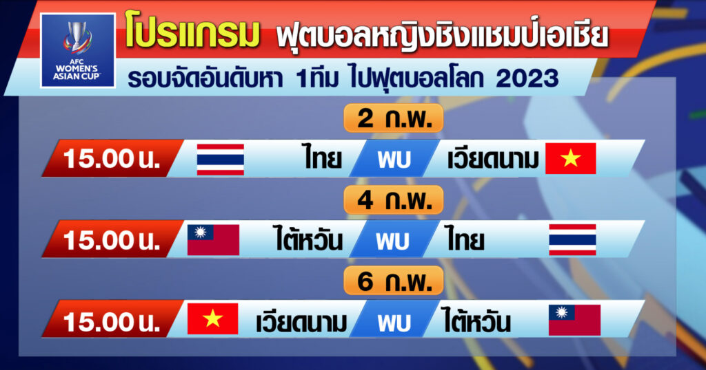 สำหรับฟุตบอลหญิงทีมชาติไทย เตรียมลงเล่นในรอบเพลย์ออฟ 2 นัด พบกับ เวียดนาม วันที่ 2 กุมภาพันธ์ 2565 เวลา 15.00 น. ต่อด้วยพบ ไต้หวัน วันที่ 4 กุมภาพันธ์ 2565 เวลา 15.00 น. โดยทีมที่มีคะแนนดีที่สุดจะได้สิทธิ์ไปลุยศึกฟุตบอลโลก 2023 รอบสุดท้าย แบบอัตโนมัติทันที. – สำนักข่าวไทย
