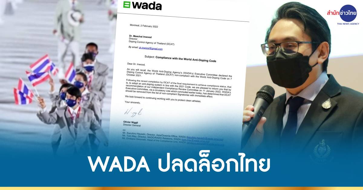 ล่าสุด WADA มีหนังสือลงวันที่ 2 กุมภาพันธ์ 2565 แจ้งว่า ตามที่คณะกรรมการบริหารของ WADA ได้ประกาศเมื่อวันที่ 7 ตุลาคม 2564 ว่า Doping Control Agency of Thailand (DCAT) ไม่ปฏิบัติตาม WADA Code นั้น บัดนี้ DCAT ได้ดำเนินการครบถ้วนในการปฏิบัติตามข้อกำหนดแล้ว กล่าวคือ ได้ทำให้ระบบการต่อต้านสารต้องห้ามมีความสอดคล้องกับ WADA 2021 แล้ว WADA จึงมีความยินดีที่จะแจ้งว่า โดยคำแนะนำของคณะกรรมการพิจารณาทบทวนการปฏิบัติตามกฎของ WADA ที่มีขึ้นเมื่อวันที่ 11 มกราคม 2565 คณะกรรมการบริหารของ WADA จึงได้ตัดสินโดยการเวียนให้มีการลงคะแนน ซึ่งสิ้นสุดเมื่อวันที่ 2 กุมภาพันธ์ 2565 และมีมติให้ DCAT ได้รับการปลดออกจากรายชื่อผู้ที่ไม่ปฏิบัติตามกฎของ WADA โดยมีผลทันที นับเป็นข่าวดีแก่วงการกีฬาของประเทศไทยอย่างยิ่ง.-สำนักข่าวไทย