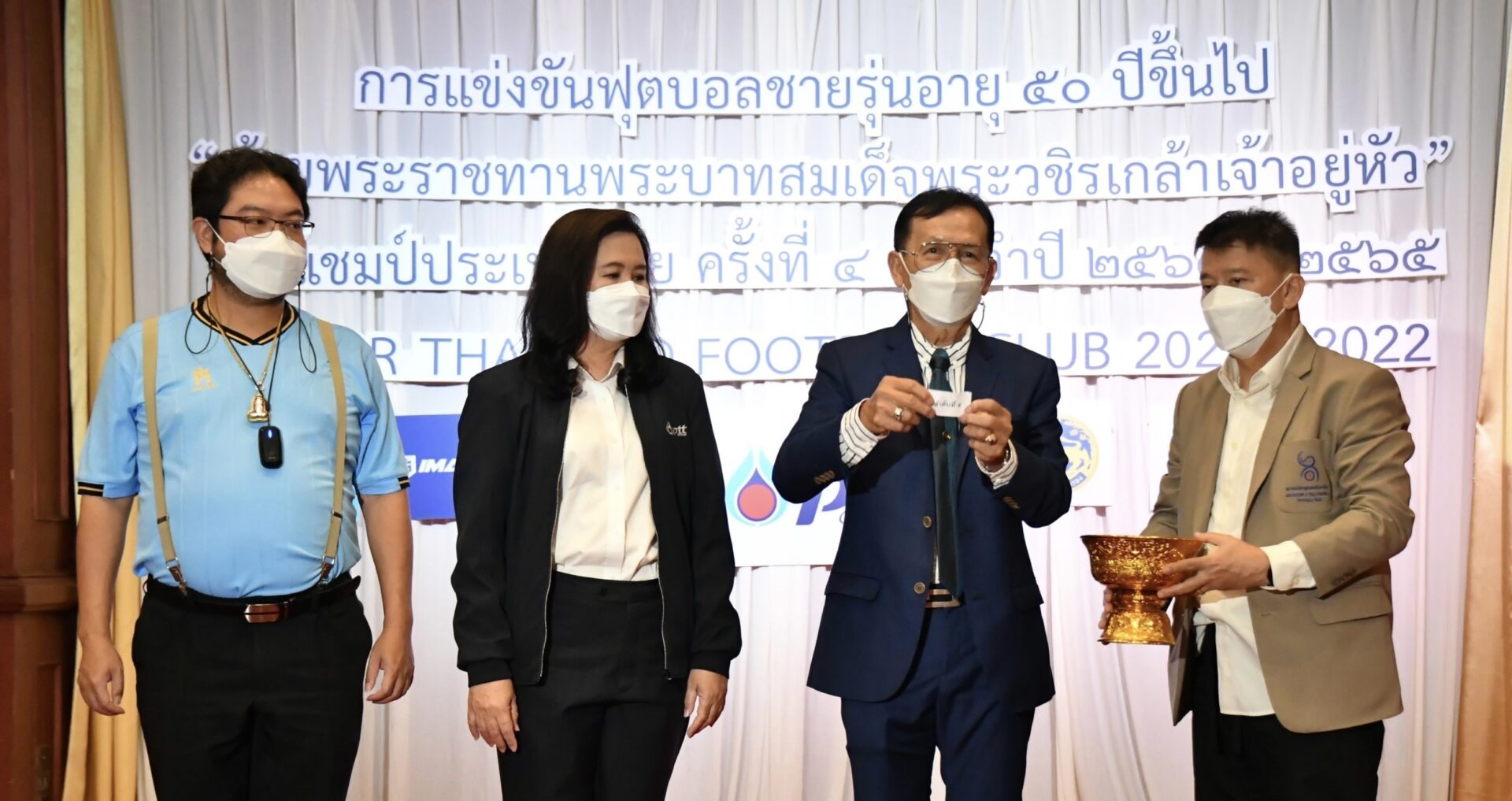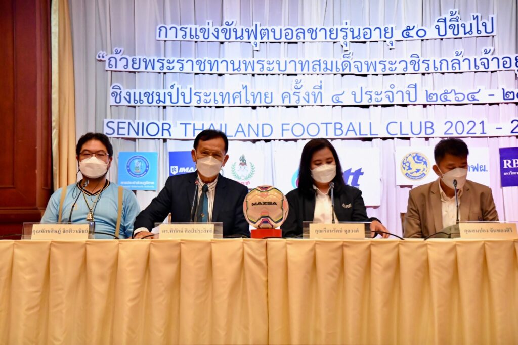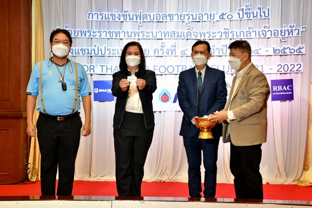 4 ก.พ.65 กรุงเทพฯ- ดร.พิทักษ์ ศิลป์ประสิทธิ์ นายกสมาคมกีฬาฟุตบอลทีมชาติไทย พร้อมด้วย คุณเรือนรัตน์ จุลวงศ์ ผู้จัดการฝ่ายสื่อสารและภาพลักษณ์องค์กร บริษัท ปตท. จำกัด(มหาชน) ,คุณวุฒิชัย ชัยจิตต์ ผู้อำนวยการกองแข่งขันกีฬาเป็นเลิศฝ่ายพัฒนากีฬาเป็นเลิศ การกีฬาแห่งประเทศไทย , คุณทักขศิษฏ์ จิตติวาณิชย์ กรรมการผู้จัดการ บริษัท ไอมาเน่ (ไทยแลนด์) จำกัด ร่วมจับสลากการแข่งขันฟุตบอลชายรุ่นอายุ 50 ปีขึ้นไป ถ้วยพระราชทานพระบาทสมเด็จพระวชิรเกล้าเจ้าอยู่หัว รายการ SENIOR THAILAND FOOTBALL CUP 2021-2022 ครั้งที่ 4 ชิงแชมป์ประเทศไทย ประจำปี 2564-2565