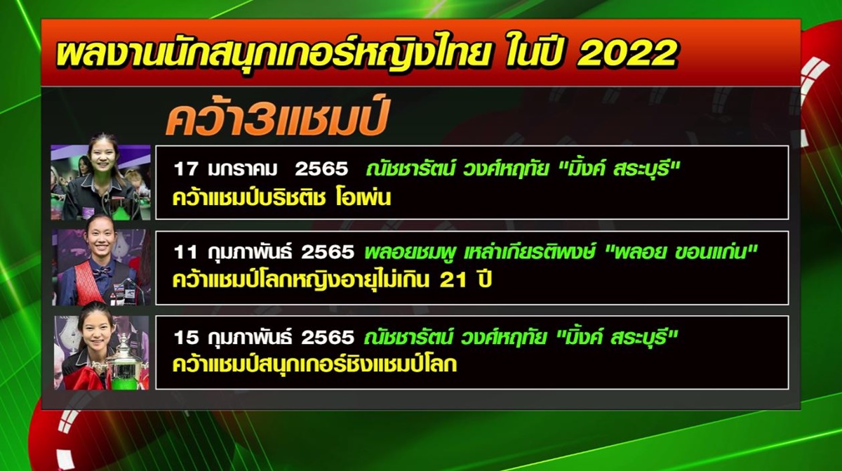 หลังจากที่ ณัชชารัตน์ วงศ์หฤทัย หรือ “มิงค์ สระบุรี” นักสอยคิวสาวทีมชาติไทย วัย 21 ปี สร้างประวัติศาสตร์คว้าแชมป์สนุกเกอร์หญิงอาชีพชิงแชมป์โลก ที่เมืองเชฟฟิลด์ ประเทศอังกฤษ ภายหลังรอบชิงชนะเลิศ พลิกกลับมาเอาชนะ เวนดี้ เจนส์ นักสนุกเกอร์สาวจากเบลเยียม หลังจากตามหลัง 3-5 เฟรม กลับมาชิงดำในเฟรมตัดสิน เอาชนะไปได้ 6-5 เฟรม แบบพลิกความคาดหมาย ใช้เวลาแข่งขันถึง 7 ชั่วโมง สร้างประวัติศาสตร์คว้าแชมป์ให้กับคนไทยได้สำเร็จ พร้อมกับได้สิทธิ์เข้าร่วมแข่งขันสนุกเกอร์หญิงชิงแชมป์โลก 2 ปีติดต่อกัน ในปี 2022-2023 และ 2023-2024