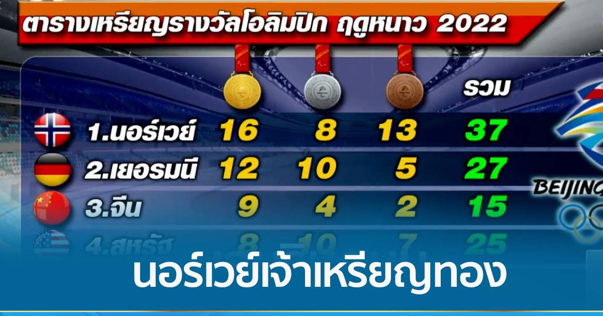 ส่วนภาพรวมเหรียญรางวัล นอร์เวย์ คว้าเจ้าเหรียญทองได้ไป 16 เหรียญทอง จีนเจ้าภาพจบที่ 3 ได้ 9 เหรียญทองเพิ่มจากครั้งก่อนถึง 8 เหรียญ ส่วนไทยไม่ได้เหรียญรางวัล. – สำนักข่าวไทย