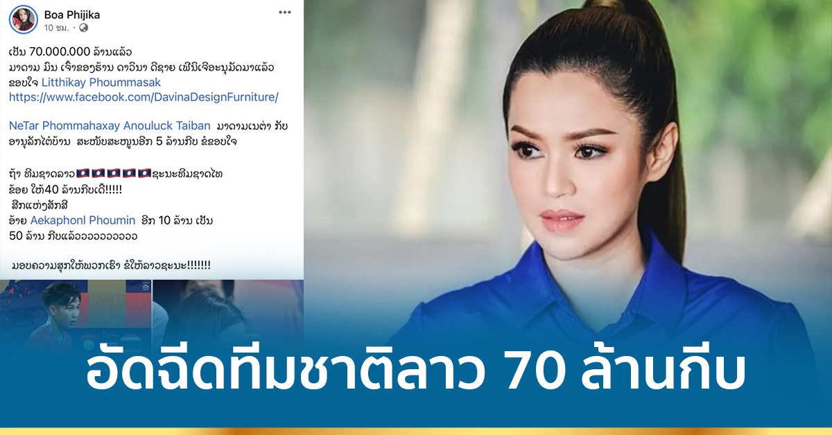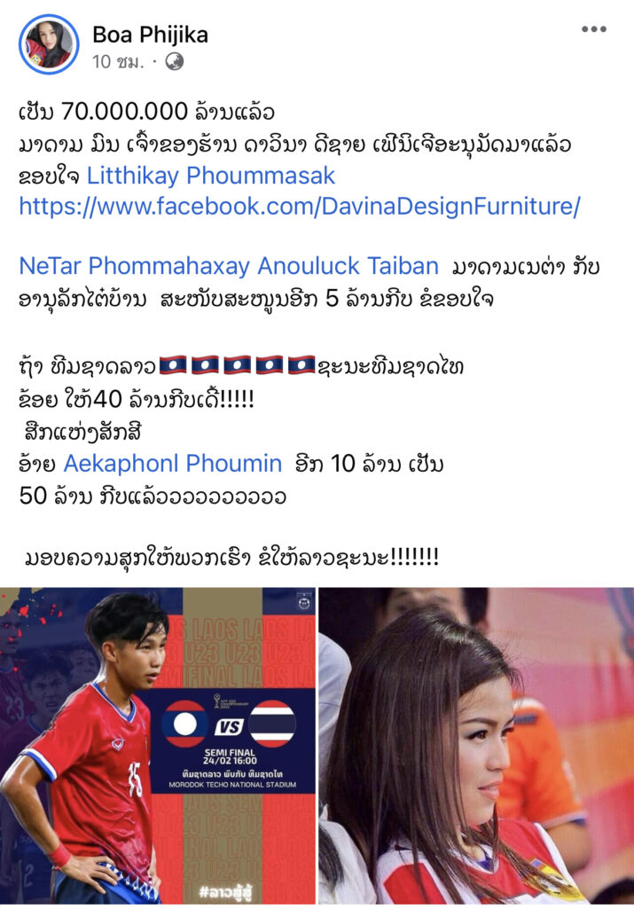 “มาดามโบ” พิจิกา บุนกว้าง อดีตประธานสโมสรเวียงจันทร์ ยูไนเต็ด โพสต์เฟสบุ๊ค อัดฉีดแข้งทีมชาติลาว 40 ล้านกีบหรือ 1.1 แสนบาท ในการแข่งขันฟุตบอลชิงแชมป์อาเซียน ยู23 ปี ที่ประเทศกัมพูชา หากชนะทีมชาติไทย ในรอบรองชนะเลิศ ในวันพรุ่งนี้ (24 ก.พ.) เวลา 16.00 น.หากชนะไทย