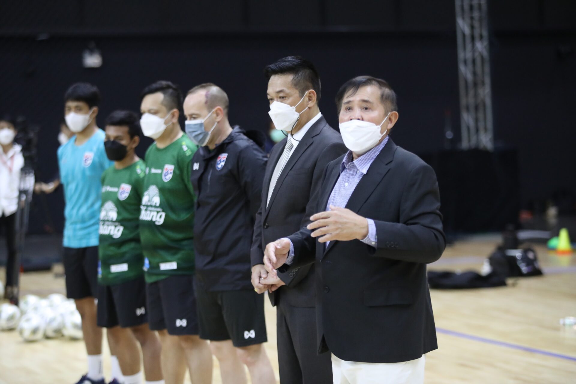 กรุงเทพฯ 4 มี.ค.65-“ทัพโต๊ะเล็กช้างศึก” ฟุตซอลทีมชาติไทย ภายใต้การคุมทัพของ คาร์ลอส เซซาร์ กุนซือใหญ่ชาวสเปน นำลูกทีมลงประเดิมลงฝึกซ้อมที่สนามแข่งจริง ณ ศูนย์การค้าโชว์ดีซี พระราม9 ก่อนเปิดฉากทัวร์นาเม้นท์ “NSDF Futsal invitation 2022” วันที่ 15-21 มี.ค.65 นี้ โดยมี “บิ๊กป๋อม” อดิศักดิ์ เบ็ญจศิริวรรณ อุปนายกสมาคมกีฬาฟุตบอลแห่งประเทศไทย พร้อมด้วย “บิ๊กสุ” สุทิน บัวตูม ผู้จัดการทีมเดินทางมาให้กำลังใจนักกีฬาและร่วมชมการฝึกซ้อมติดขอบสนาม