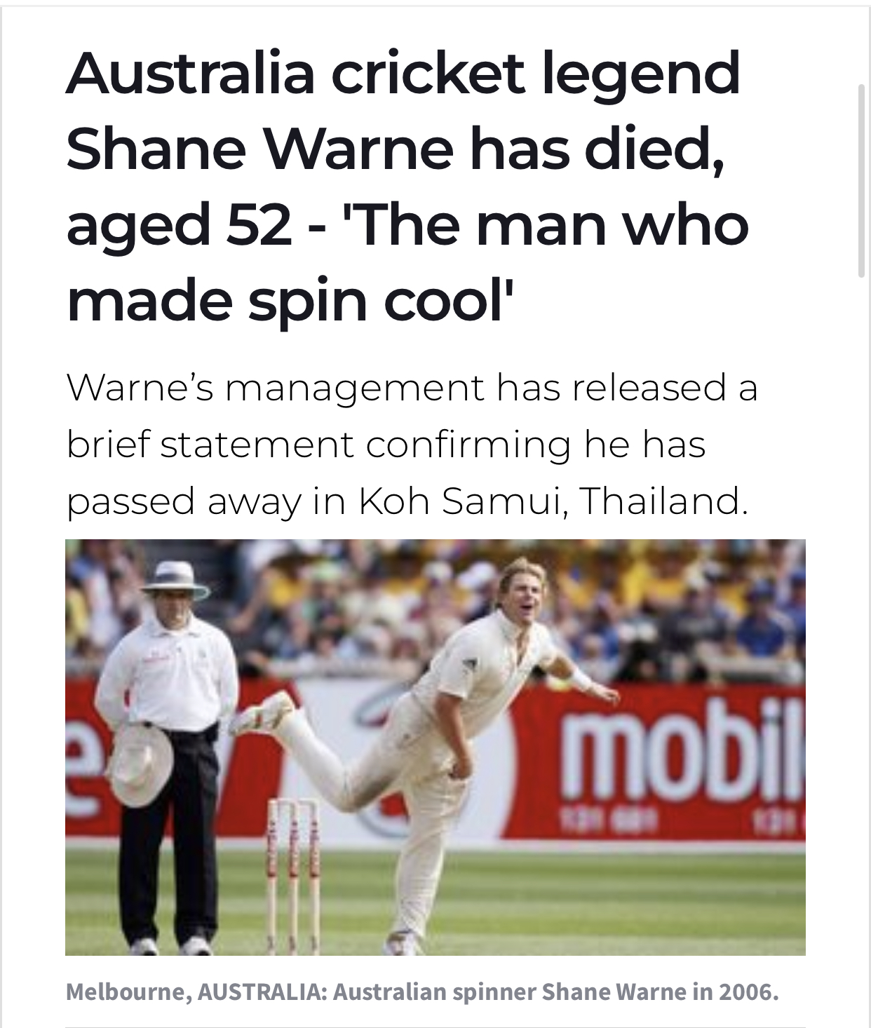ไอร์เเลนด์ 4 มี.ค.- สื่อต่างประเทศ Irish Examiner ของไอร์แลนด์ เผยแพร่ข่าวบนเว็บไซต์ว่า เชน วอร์น (Shane warne) นักกีฬาคริกเก็ตชื่อดังระดับตำนานชาวออสเตรเลีย วัย 52 เสียชีวิตที่เกาะสมุย ของประเทศไทย คาดสาเหตุเกิดจากหัวใจวายเมื่อวันศุกร์ที่ 4 มีนาคม