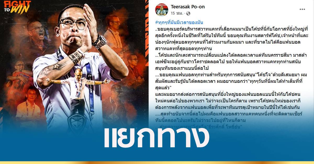 หลังจากต้องแยกทางกับทีม “โค้ชโจ” ธีระศักศิ์ ได้โพสต์ผ่านเฟซบุ๊กว่า โค้ชและนักเตะสามารถเปลี่ยนแปลงได้ตลอด แต่ที่อยู่ตลอดไปคือสโมสร ขอบคุณทุกการสนับสนุน และอยากให้แฟนบอลให้การสนับสนุนโค้ชคนใหม่ด้วย โค้ชโจ วัย 43 ปี คุมทีม นครราชสีมา มาสด้า เอฟซี มาตั้งแต่เดือนพฤศจิกายนปี 2019 พาทีมจบอันดับ 9 ในฤดูกาลก่อน