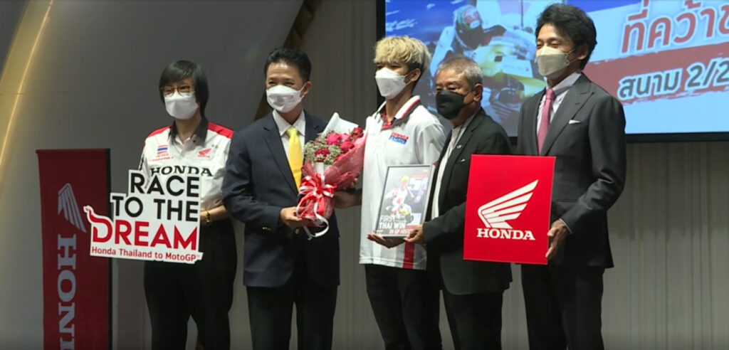 “ก้อง” สมเกียรติ จันทรา นักบิดจากโครงการ “ฮอนด้า เรซ ทู เดอะ ดรีม” ที่เพิ่งคว้าแชมป์ครั้งแรกในศึกโมโตทู ชิงแชมป์โลก รายการอินโดนีเซียน กรังด์ปรีซ์ หลังบิดนำแบบม้วนเดียวจบ ที่เปอร์ตา มันดาลิกา เซอร์กิต ประเทศอินโดนีเซีย ทำสถิติเป็นคนไทยคนแรกที่ได้ยืนโพเดี้ยมสูงสุดในการแข่งขันระดับเวิลด์ กรังด์ปรีซ์ เปิดเผยหลังเดินทางกลับจากอินโดนีเซียว่า รู้สึกภูมิใจมาก และขอมอบชัยชนะในครั้งนี้ให้คนไทยทุกคน และต้องขอบคุณทีมฮอนด้า ที่ทำรถได้ยอดเยี่ยมมาก ตนลงแข่งขันรายการนี้ ทั้งๆ ที่ได้รับบาดเจ็บ แต่ก็ทนเจ็บจนคว้าแชมป์ได้ และตั้งเป้าว่าจะคว้าแชมป์มาให้ได้อีก 1 รายการเป็นอย่างน้อย ทั้งที่อาร์เจนตินา, ออสเตรีย , สเปน หรือที่สนามช้าง อินเตอร์เนชั่นแนล เซอร์กิต พร้อมฝากให้แฟนมอเตอร์สปอร์ตชาวไทย ช่วยติดตามเชียร์ตนด้วย พร้อมมุ่งมั่นจะทำผลงานให้ดีที่สุด