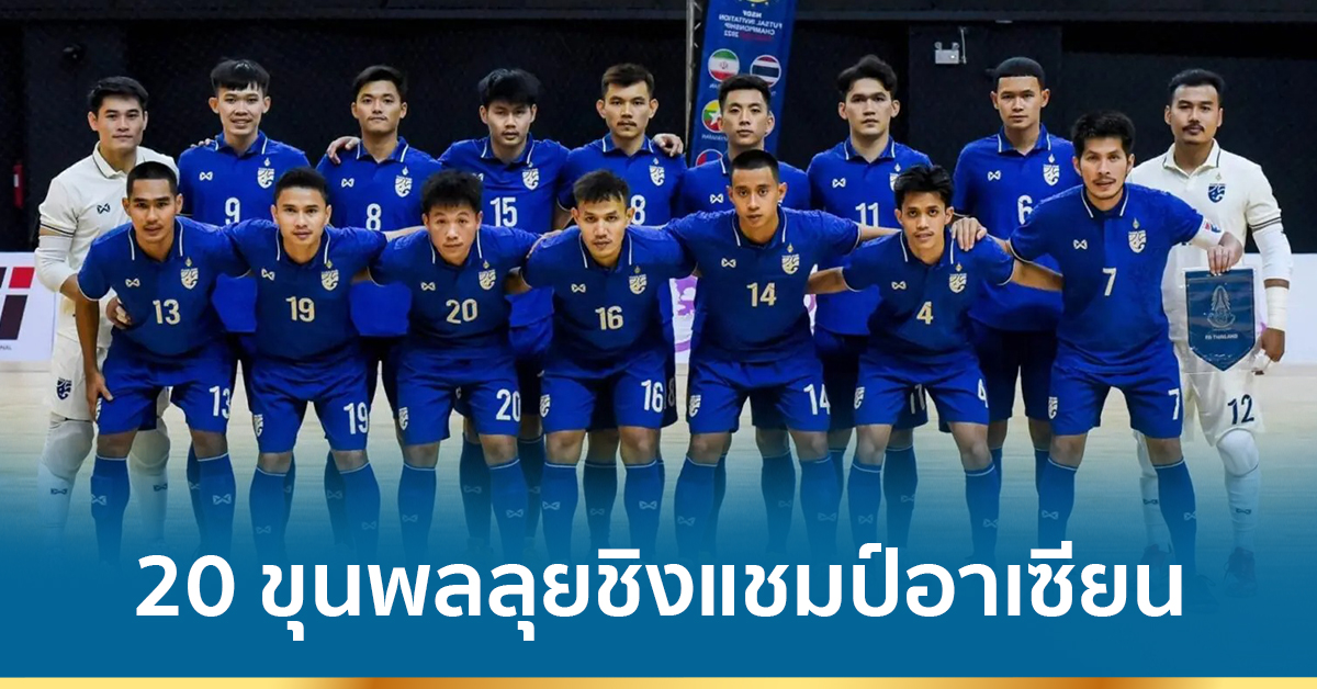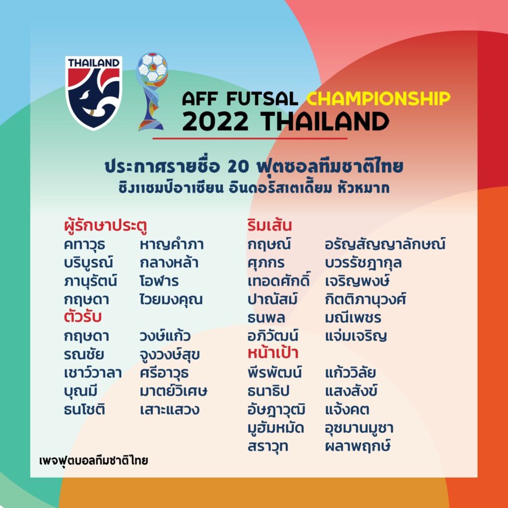 กรุงเทพฯ 23 มี.ค.-สมาคมกีฬาฟุตบอลแห่งประเทศไทยฯ ประกาศรายชื่อ 20 นักฟุตซอลทีมชาติไทย ชุดเตรียมป้องกันแชมป์อาเซียนสมัยที่ 16 “AFF Futsal Championship 2022” ที่จะมีขึ้น ณ อินดอร์สเตเดียม หัวหมาก ระหว่างวันที่ 2-10 เม.ย.65