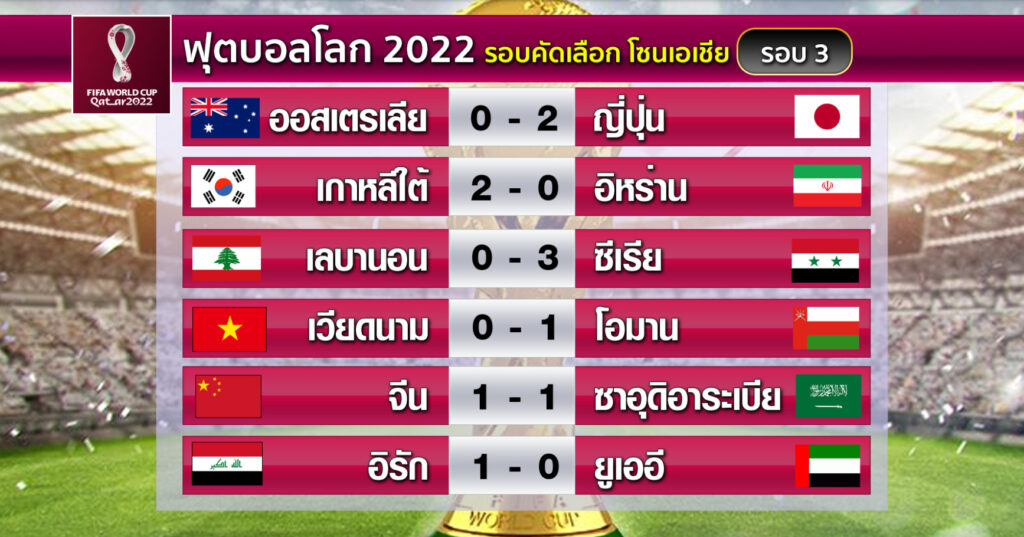ส่วนผลคู่อื่น เลบานอน แพ้ ซีเรีย 0-3, เวียดนาม แพ้ โอมาน 0-1, อิรัก ชนะ ยูเออี 1-0 ส่งผลให้โซนเอเชีย ตอนนี้ได้ เกาหลีใต้, อิหร่าน, ญี่ปุ่น และซาอุดิอาระเบีย ที่ผ่านเข้ารอบสุดท้ายที่กาตาร์แน่นอนแล้ว