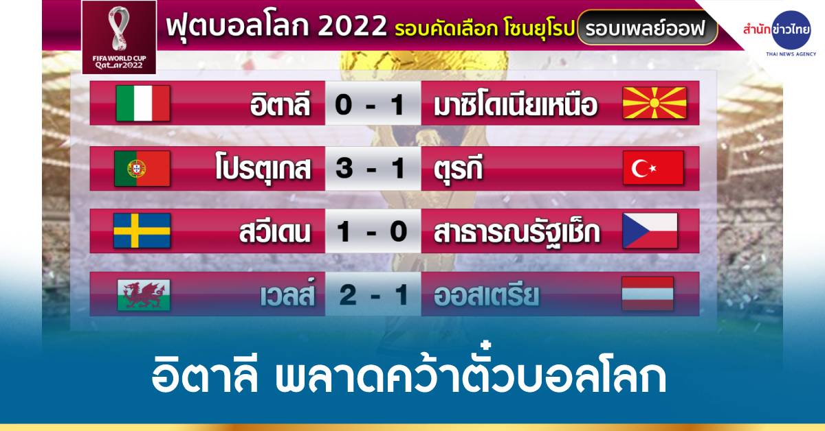 ส่วนรอบคัดเลือก โซนยุโรป รอบเพลย์ออฟ อิตาลี แพ้ มาซิโดเนียเหนือ 0-1 ทำให้อิตาลี พลาดคว้าตั๋วไปลุยฟุตบอลโลก รอบสุดท้าย 2 สมัยติดต่อกันเป็นครั้งแรก, โปรตุเกส ชนะ ตุรกี 3-1, สวีเดน ชนะ สาธารณรัฐเช็ก 1-0 ในช่วงต่อเวลาพิเศษ เวลส์ ชนะ ออสเตรีย 2-1.-สำนักข่าวไทย