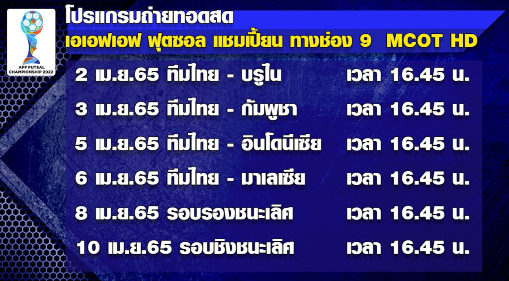 สำหรับทีมฟุตซอลไทย สายเอ ร่วมกับบรูไน, กัมพูชา, อินโดนีเซีย และมาเลเซีย นัดแรกไทยจะประเดิมสนามพบกับ บรูไน ในวันที่ 2 เม.ย.นี้ ช่อง 9 MCOT HD ถ่ายทอดสดทุกนัดที่ไทยลงสนาม. – สำนักข่าวไทย