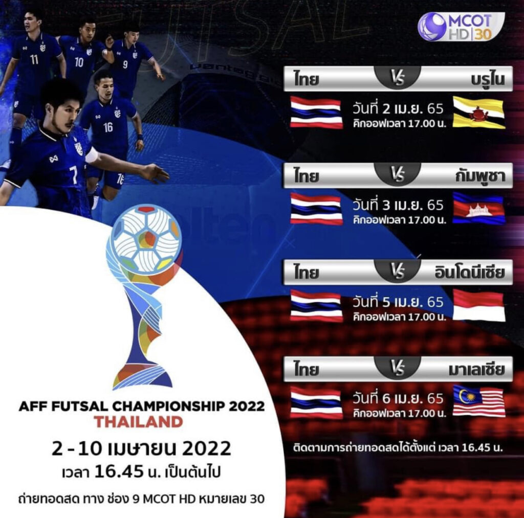 โดยโปรแกรมของฟุตซอลทีมชาติไทย ลงสนาม ช่อง 9 MCOT HD จะถ่ายทอดสดให้ชมตั้งแต่เวลา 16.45 น.เป็นต้นไป