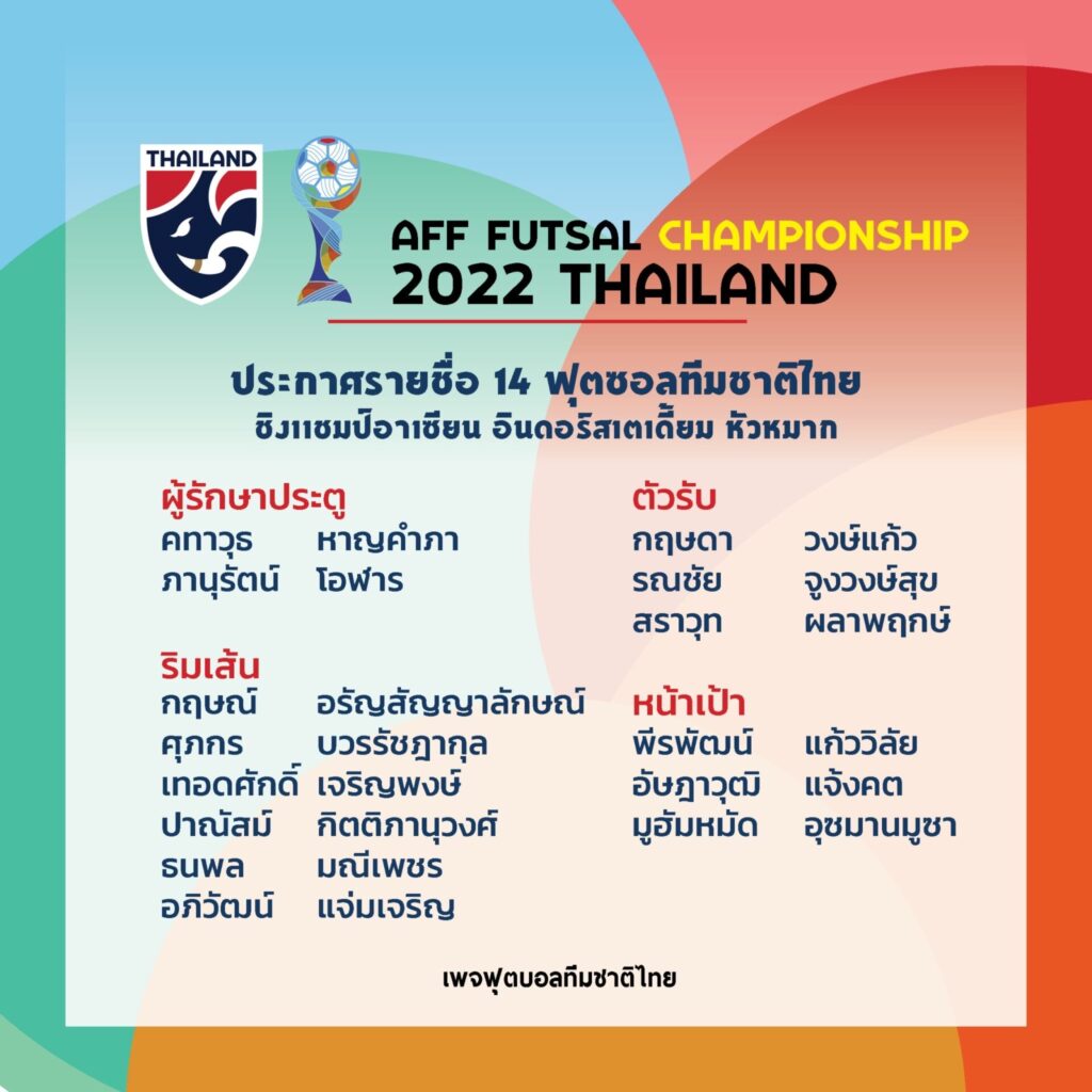 กรุงเทพฯ 31 มี.ค.65-สมาคมกีฬาฟุตบอลแห่งประเทศไทยฯ ประกาศรายชื่อ 14 แข้ง “ทัพโต๊ะเล็กช้างศึก” ฟุตซอลทีมชาติไทย ชุดลุยศึก”AFF Futsal Championship 2022″ ป้องกันแชมป์อาเซียน สมัยที่ 16 ระหว่างวันที่ 2-10 เม.ย.65 นี้ ที่อินดอร์สเตเดี้ยมหัวหมาก โดยการเรียกตัวครั้งนี้จะเเรียกเข้าแคมป์ทั้งหมด 18 คน ส่งรายชื่อในทัวร์นาเมนต์ 14 คน อีก 4 คนเป็นการเตรียมความพร้อมเพื่อป้องกันกรณีมีปัญหาโควิด-19 เกิดขึ้น