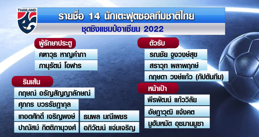 หลังจากสมาคมกีฬาฟุตบอลแห่งประเทศไทย ประกาศรายชื่อ 14 แข้งโต๊ะเล็กช้างศึก ฟุตซอลทีมชาติไทย ชุดลุยศึก AFF Futsal Championship 2022 ป้องกันแชมป์อาเซียน สมัยที่ 16 ระหว่างวันที่ 2-10 เม.ย.นี้ ที่อินดอร์ สเตเดียมหัวหมาก การเรียกตัวครั้งนี้จะเรียกเข้าแคมป์ทั้งหมด 18 คน ส่งรายชื่อในทัวร์นาเมนต์ 14 คน อีก 4 คน เป็นการเตรียมความพร้อมเพื่อป้องกันกรณีมีปัญหาโควิด-19 ที่อาจจะเกิดขึ้นในช่วงแข่งขัน นำทัพโดยพี่ใหญ่ “กัปตันช้าง” กฤษดา วงษ์แก้ว, อภิวัฒน์ แจ่มเจริญ คฑาวุธ หาญคำภา, มูฮัมหมัด อุซมานมูซา ดาวซัลโวสูงสุดฟุตซอลไทยแลนด์ลีก และพีรพัฒน์ แก้ววิลัย เจ้าของรางวัลเอ็มวีพี ในฟุตซอลรายการ NSDF FUTSAL INVITATION CHAMPIONSHIP THAILAND 2022 นำทัพผสมกับนักเตะหน้าใหม่ที่ติดทีมชาติครั้งแรกอย่าง ภานุรัตน์ โอฬาร จากสโมสรธรรมศาสตร์ สแตลเลี่ยน, สราวุท ผลาพฤกษ์, กฤษณ์ อรัญสัญญาลักษณ์ จากฟรีไฟร์ บลูเวฟ ชลบุรี และอัษฎาวุฒิ แจ้งคต และเทอดศักดิ์ เจริญพงษ์ จากห้องเย็นท่าข้าม