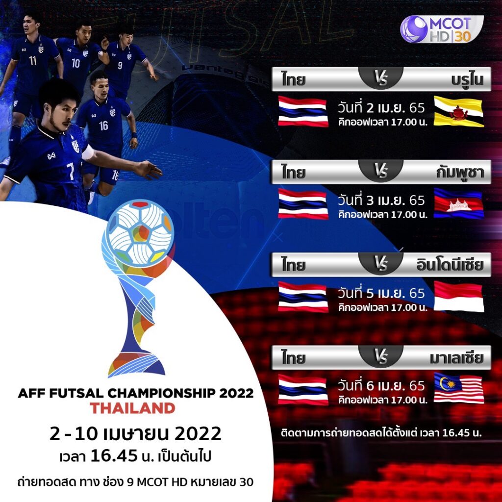 สำหรับโปรแกรมรอบแบ่งกลุ่ม ของทีมชาติไทย ที่ช่อง 9 MCOT HD ถ่ายทอดสด เริ่มวันที่ 2 เม.ย. ไทย พบ บรูไน เริ่มเวลา 16.45 น.เป็นต้นไป. – สำนักข่าวไทย