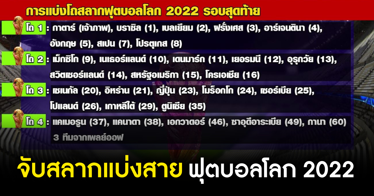กาตาร์ 1 เม.ย. – ฟุตบอลโลก 2022 รอบสุดท้าย จะมีการจับสลากแบ่งกลุ่ม ที่กรุงโดฮา ประเทศกาตาร์ เวลา 23.00 น. คืนนี้ (1 เม.ย.) ตามเวลาประเทศไทย โดยรูปแบบการจับสลากรอบแบ่งกลุ่ม จะแบ่งออกเป็น 4 โถ โถละ 8 ทีม ซึ่งจะยึดตามอันดับฟีฟ่า เวิลด์ แรงกิ้ง ล่าสุด โดยจะยังคงแบ่งเป็น 8 กลุ่ม กลุ่มละ 4 ทีมเหมือนเดิม โดยมีเงื่อนไขว่า ทีมที่อยู่ในทวีปเดียวกันจะไม่เจอกันในรอบแบ่งกลุ่ม ยกเว้นทวีปยุโรป. – สำนักข่าวไทย
