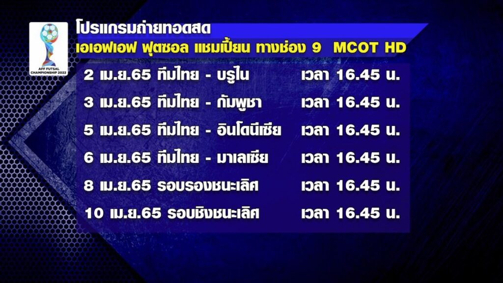 สำหรับโปรแกรมรอบแบ่งกลุ่มของทีมชาติไทย ที่ช่อง 9 MCOT HD หมายเลข 30 ถ่ายทอดสด เริ่มวันที่ 2 เม.ย.65 ไทย พบ บรูไน เริ่มเวลา 16.45 น. เป็นต้นไป. – สำนักข่าวไทย