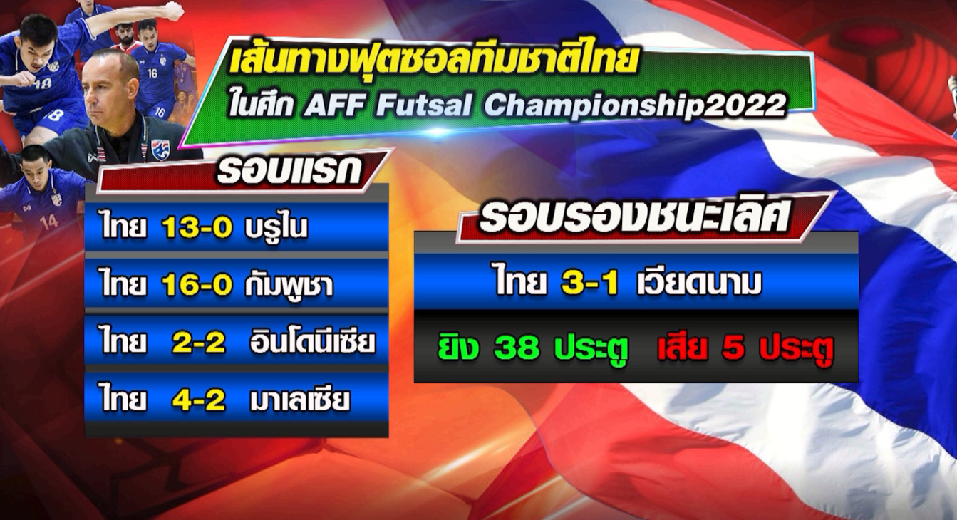 สำหรับ “โต๊ะเล็กช้างศึก” ผลงาน 5 ที่ผ่านมา ชนะ บรูไน 13-0 ,ชนะ กัมพูชา 16-0 ,เสมอ อินโดนีเซีย 2-2 ,ชนะ มาเลเซีย 4-2 และ ชนะ เวียดนาม 3-1 ในรอบรองชนะเลิศ ทำให้ยิงรวมไปแล้ว 38 และ เสีย 5 ประตู