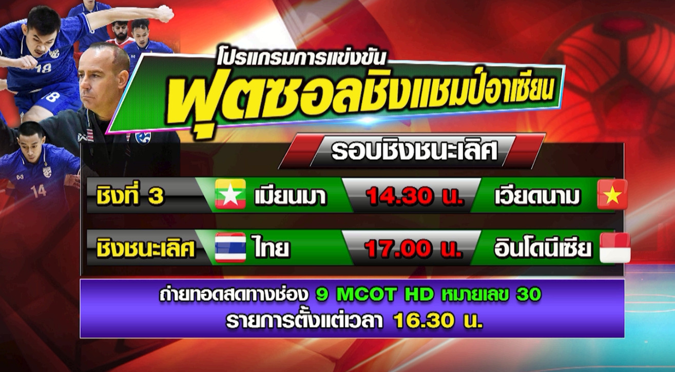 สำหรับโปรแกรมฟุตซอลชิงแชมป์อาเซียน สองนัดสุดท้าย ในวันนี้ คู่แรก เวลา 14.30 น. คู่ชิงอันดับ 3 เมียนมา พบ เวียดนาม เพื่อแย่งชิงตั๋วใบสุดท้ายศึกฟุตซอลชิงแชมป์เอเชีย และ คู่ที่สอง เวลา 17.00 น. คู่ชิงชนะเลิศ ไทย พบ อินโดนีเซีย ถ่ายทอดสดทางช่อง 9 MCOT HD หมายเลข 30 เข้ารายการตั้งแต่เวลา 16.30 น.-สำนักข่าวไทย