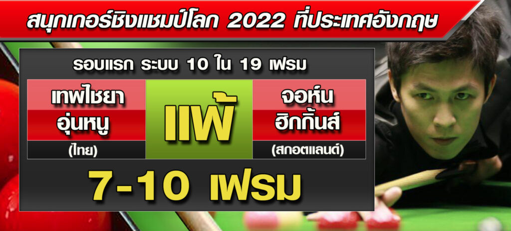 ส่วนผลงานของ 2 นักสอยคิวหนุ่มไทย “เอฟวัน” เทพไชยา อุ่นหนู มือ 53 ของโลก ที่ขึ้นนำ จอห์น ฮิกกินส์ อดีตแชมป์โลก 4 สมัยจากสกอตแลนด์ในเซสชั่นแรก 5-4 เฟรม มาถูกแซงเอาชนะ 10-7 เฟรม ตกรอบอย่างน่าเสียดาย ส่วนฮิกกิ้นส์ ผ่านเข้ารอบ 2
