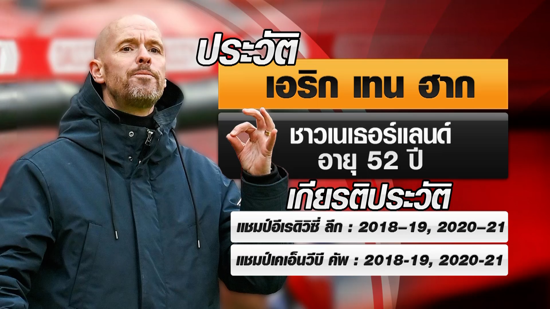 สำหรับ เทน ฮาก เป็นกุนซือชาวเนเธอร์แลนด์ ปัจจุบันอายุ 52 ปี โดยเคยคุมทีมมาแล้ว 4 สโมสร ทีมล่าสุดคือ อาแจ็กซ์ ที่เริ่มทำงานตั้งแต่ปี 2017 และพาทีมได้ดับเบิ้ลแชมป์บอลลีกและบอลถ้วยในฤดูกาล 2018–19 และฤดูกาล 2020–21.-สำนักข่าวไทย