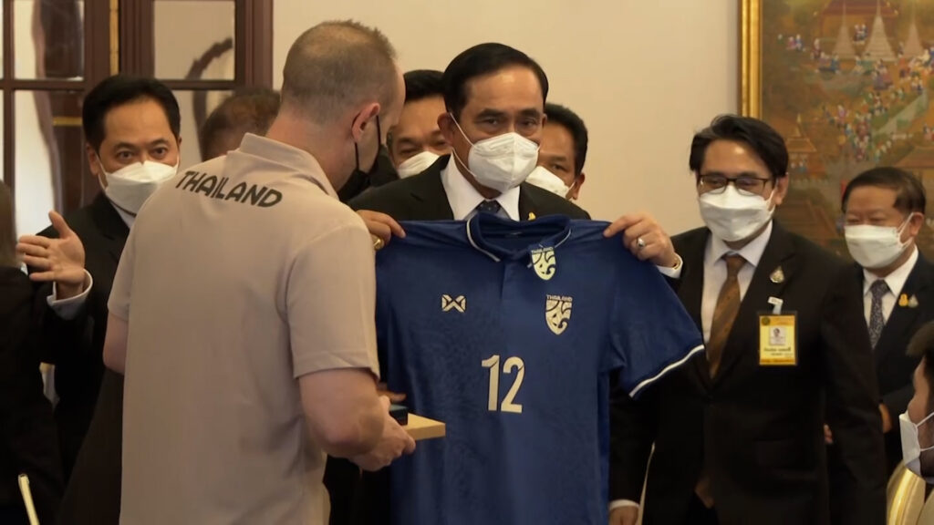 โอกาสนี้ นายอดิศักดิ์ เบ็ญจศิริวรรณ อุปนายกสมาคมฯ ประธานพัฒนาฟุตซอลและฟุตบอลชายหาดเป็นตัวแทนมอบเสื้อทีมชาติไทย หมายเลข 12 ให้กับนายกรัฐมนตรี ซึ่งเป็นเสื้อหมายเลขประจำตัว ฟัลเกา ตำนานนักฟุตซอลอันดับ 1 ของโลก และเป็นหมายเลขรุ่นนักเรียนเตรียมทหารของนายกรัฐมนตรีพร้อมกล่าวขอบคุณนายกรัฐมนตรีที่เป็นกำลังใจ และสนับสนุนนักฟุตซอลทีมชาติไทยและกีฬาฟุตซอลไทยมาโดยตลอด