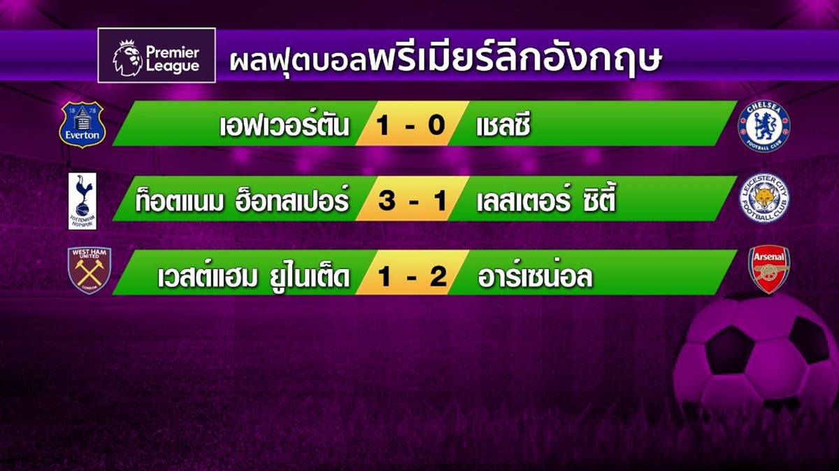 ส่วนผลอีก 2 คู่ ท็อตแนม ฮอตสเปอร์ส ชนะ เลสเตอร์ ซิตี้ 3-1 เวสต์แฮม ยูไนเต็ด แพ้ อาร์เซนอล 1-2