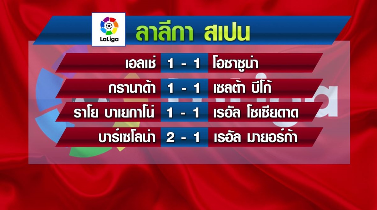 ผลฟุตบอลลา ลีกา สเปน เอลเช่ เสมอ โอซาซูนา 1-1 กรานาดา เสมอ เซลตา บีโก 1-1 ราโย บาเยกาโน เสมอ เรอัล โซเซียดาด 1-1 บาร์เซโลนา ชนะ เรอัล มายอร์กา 2-1