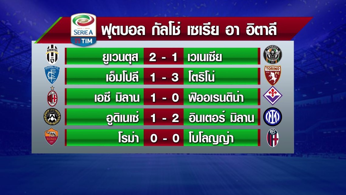 ผลฟุตบอลกัลโช เซเรีย อา อิตาลี ยูเวนตุส ชนะ เวเนเซีย 2-1 เอ็มโปลี แพ้ โตริโน 1-3 เอซี มิลาน ชนะ ฟิออเรนตินา 1-0 อูดิเนเซ แพ้ อินเตอร์ มิลาน 1-2 โรมา เสมอ โบโลญญา 0-0. – สำนักข่าวไทย