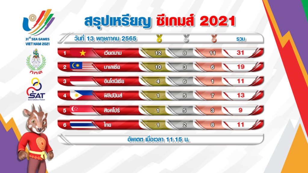สรุปเหรียญ ซีเกมส์ 2021 วันที่ 13 พฤษภาคม 2565 อัปเดต เมื่อเวลา 11.15 น.