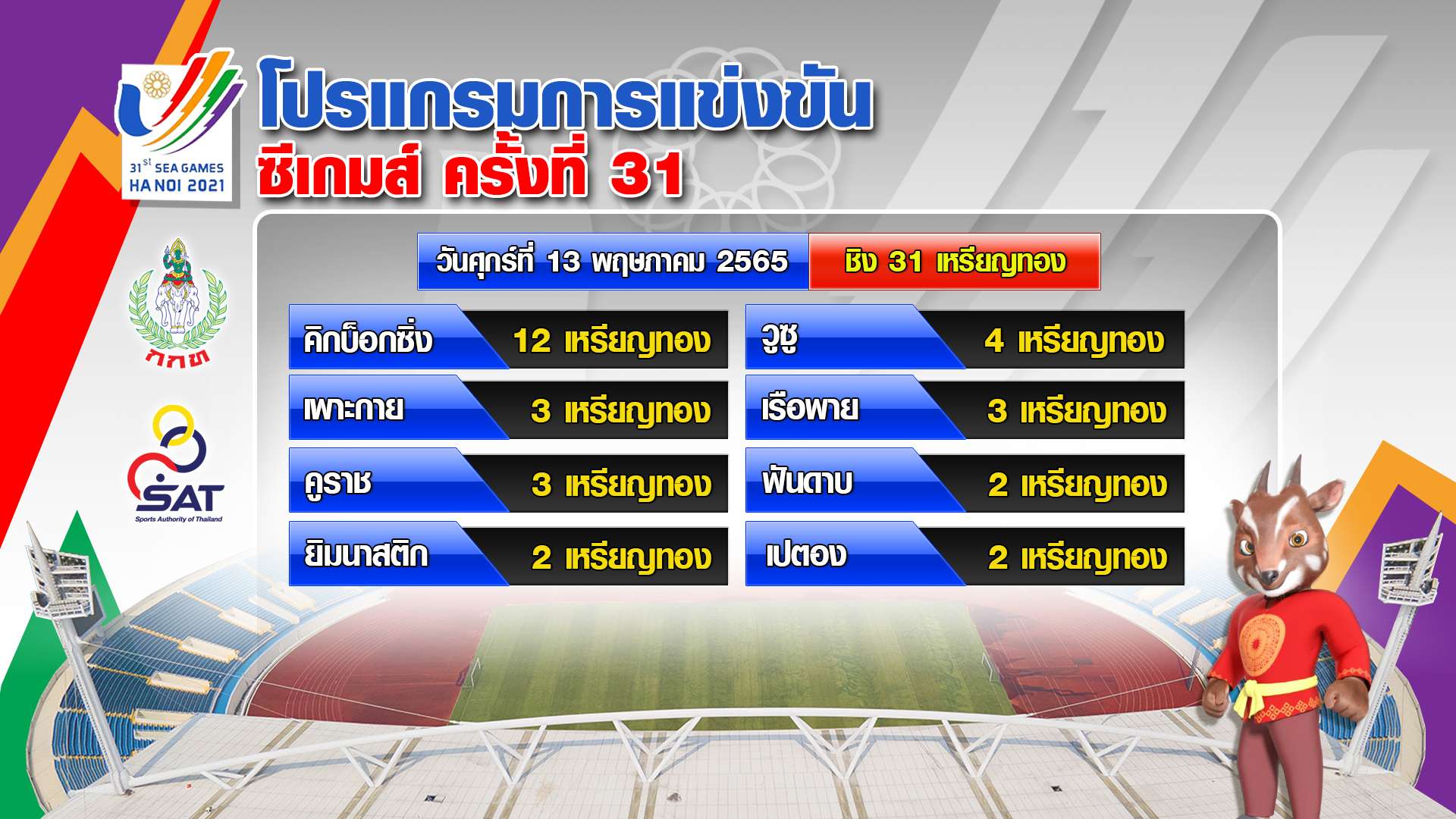 มหกรรมกีฬาซีเกมส์ ครั้งที่ 31 ที่ประเทศเวียดนาม วันนี้ (13 พฤษภาคม 2565) ชิงชัยทั้งหมด 31 เหรียญทอง เริ่มที่ คิกบ็อกซิ่ง 12 เหรียญทอง เพาะกาย 3 เหรียญทอง คูราช 3 เหรียญทอง ยิมนาสติก 2 เหรียญทอง วูซู 4 เหรียญทอง เรือพาย 3 เหรียญทอง ฟันดาบ 2 เหรียญทอง และเปตอง 2 เหรียญทอง