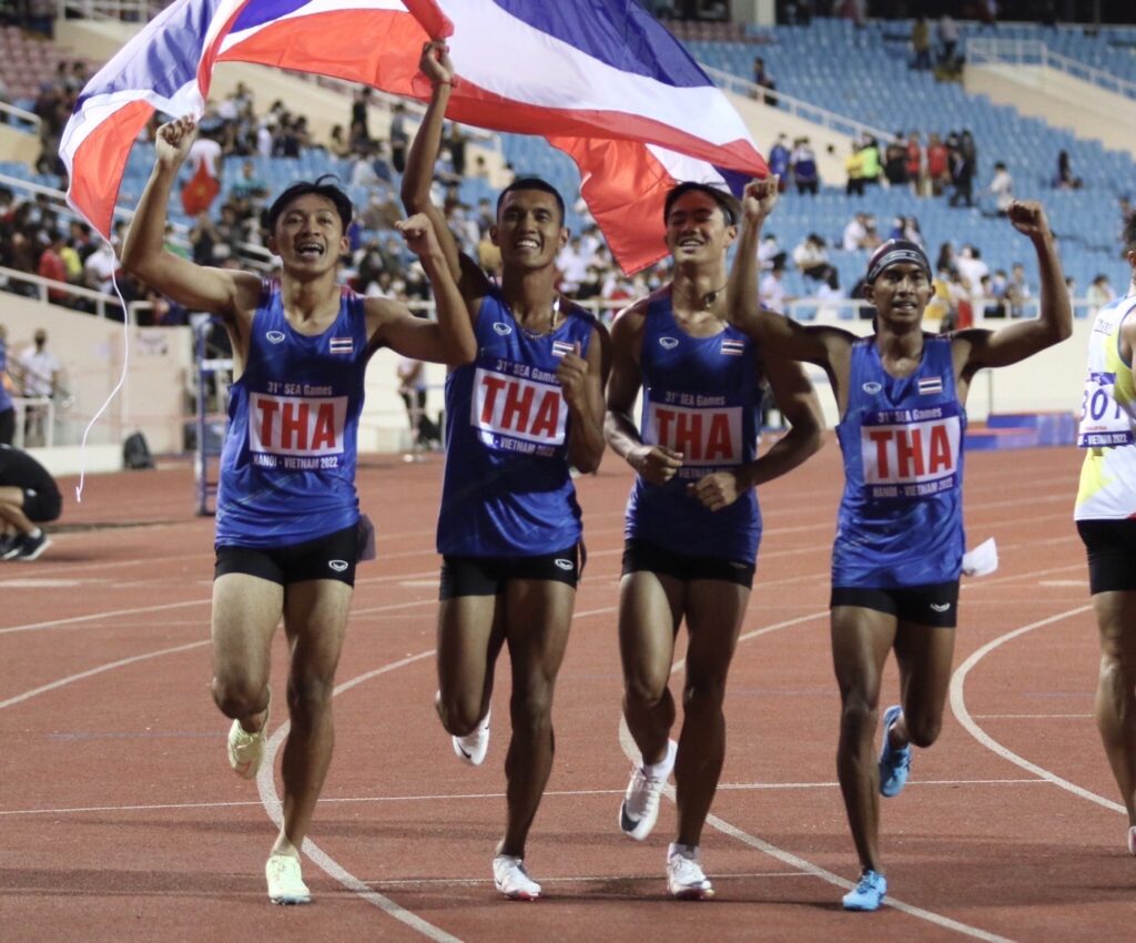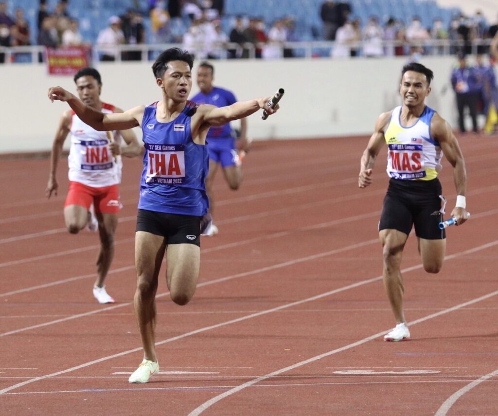 ด้าน 4 x 100 เมตรชาย ทีมไต้ฝุ่นชายไทย แชมป์ซีเกมส์ 24 สมัย และแชมป์เก่าซีเกมส์ที่ฟิลิปปินส์ ลงสนามในรอบชิงชนะเลิศ ประกอบด้วย ไม้ 1 ชยุตม์ คงประสิทธิ์, ไม้ 2 สรอรรถ ดาบบัง, ไม้ 3 ศิริพล พันธ์แพ และไม้ 4 ภูริพล บุญสอน ทีมไต้ฝุ่นไทย วิ่งเข้าเส้นชัยเป็นทีมแรก ด้วยเวลา 38.58 วินาที ทำลายสถิติซีเกมส์ ที่รุ่นพี่ทีมชาติไทย ทำไว้เวลา 39.27 วินาที เมื่อปี 2019 และดีกว่าสถิติประเทศไทยที่ทำไว้ 38.70 วินาที.-สำนักข่าวไทย