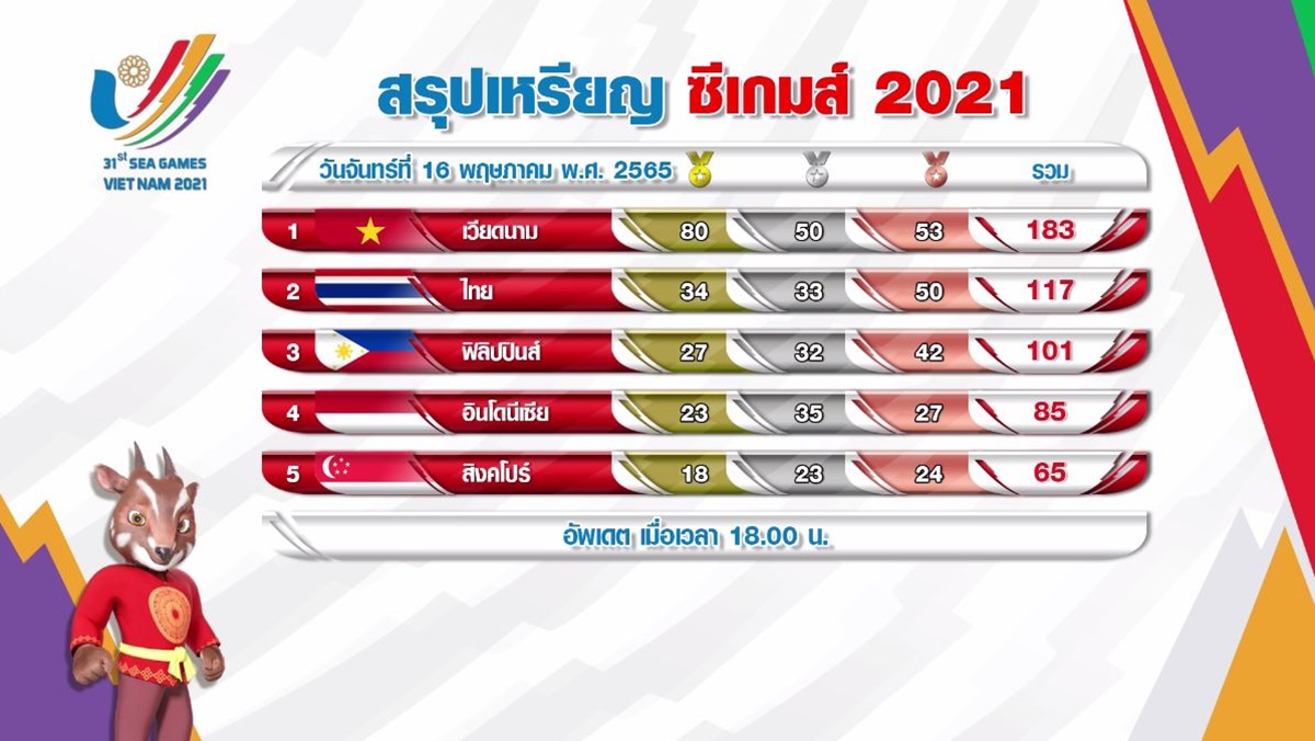 สรุปเหรียญทองซีเกมส์ ครั้งที่ 31 ณ เวลา 18.00 น. วันที่ 16 พ.ค.65