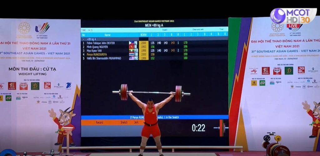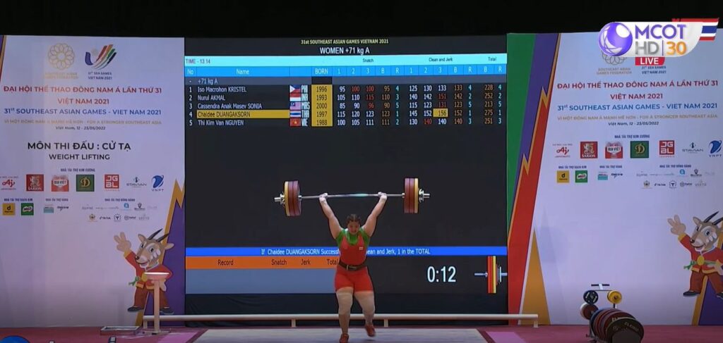 ยกน้ำหนัก ที่ฮานอย สปอร์ต เทรนนิ่ง เซ็นเตอร์ กรุง แข่งขันเป็นวันสุดท้าย ชิงชัยอีก 3 รุ่น ในรุ่นมากกว่า 71 กิโลกรัม ไทยส่ง “ส้ม” ดวงอักษร ใจดี เจ้าของเหรียญทอง ยกน้ำหนักชิงแชมป์โลก 2021 ที่อุซเบกิสถาน โดยในท่าสแนตช์ “ส้ม” โชว์ความแข็งแกร่ง ยกผ่านทั้ง 3 หน ที่น้ำหนัก 115, 120 และ 123 กิโลกรัม ขึ้นนำเป็นอันดับ 1