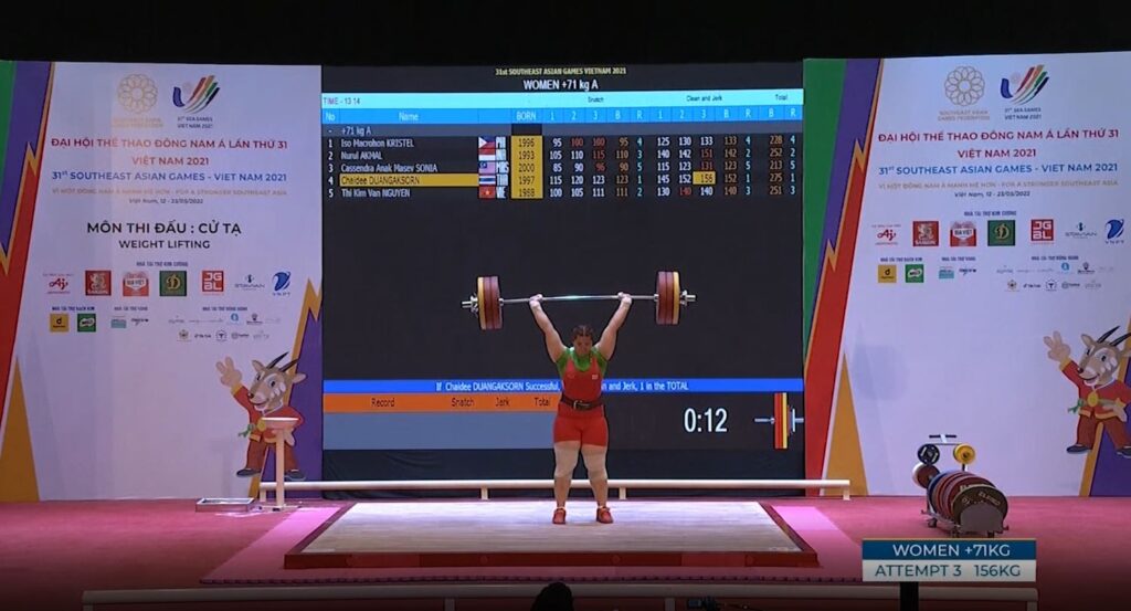 สำหรับ 6 เหรียญทองในซีเกมส์ครั้งนี้ ได้มาจาก 2 จอมพลังสาวแชมป์โลก 2021 ธรรญธร สุขข์เจริญ รุ่น 45 กิโลกรัมหญิง , สุรจนา คำเบ้า รุ่น 49 กิโลกรัมหญิง , วิษณุ จันทรี รุ่น 67 กิโลกรัมชาย , ณัฐวุฒิ สืบสวน รุ่น 81 กิโลกรัมชาย , ดวงอักษร ใจดี รุ่น +71 กิโลกรัมหญิง และรุ่งสิริยา ปัญญะ รุ่น +89 กิโลกรัมชาย