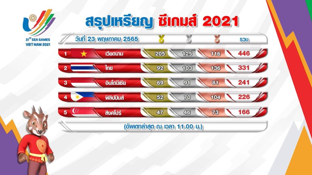 สรุปเหรียญทองซีเกมส์ ครั้งที่ 31 เวียดนาม เจ้าภาพ ครองเจ้าเหรียญทองด้วยผลงาน 205 เหรียญทอง 125 เหรียญเงิน 116 เหรียญทองแดง ขณะที่ทัพนักกีฬาทีมชาติไทย ได้อันดับ 2 มี 92 เหรียญทอง 103 เหรียญเงิน และ 136 เหรียญทองแดง อันดับ 3 อินโดนีเซีย 69 เหรียญทอง อันดับ 4 ฟิลิปปินส์ 52 เหรียญทอง และอันดับ 5 สิงคโปร์ 47 เหรียญทอง