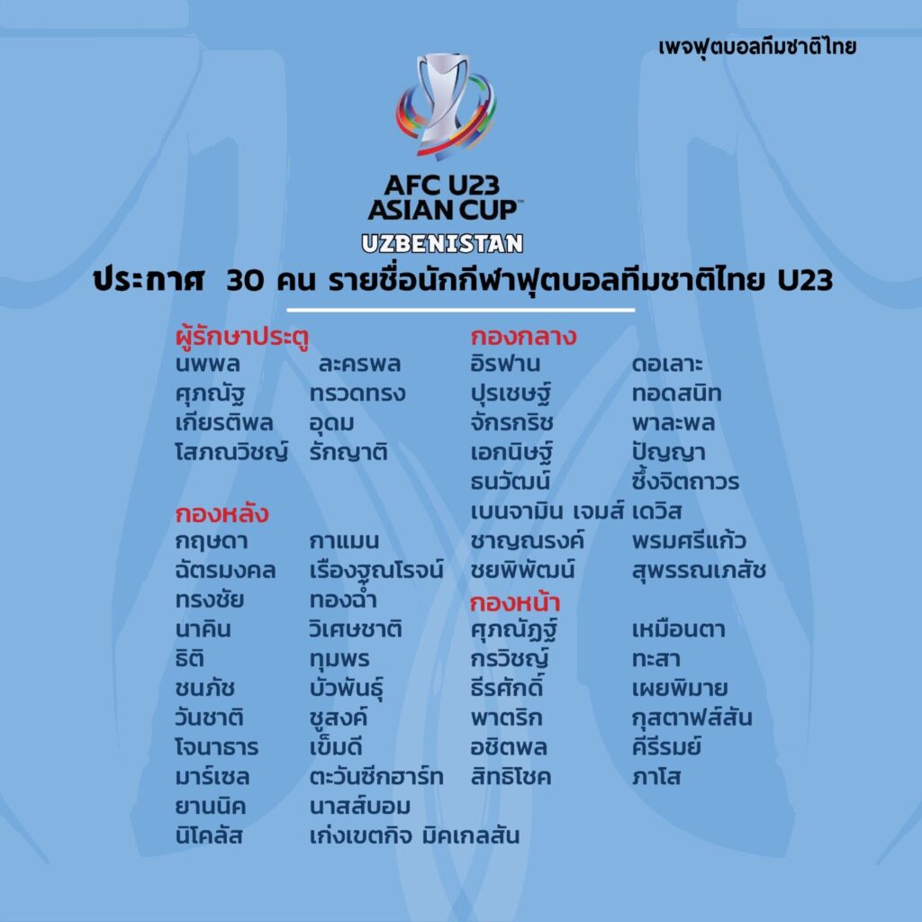 กรุงเทพฯ 24 พ.ค.65-ตามที่ สมาคมกีฬาฟุตบอลแห่งประเทศไทย ในพระบรมราชูปถัมภ์ฯ เตรียมความพร้อมนักกีฬาทีมชาติไทย รุ่นอายุไม่เกิน 23 ปี เพื่อลงแข่งขันฟุตบอลรายการ AFC U23 Asian Cup Uzbekistan 2022 ที่ ประเทศอุซเบกิสถาน ซึ่งจะแข่งขันกันระหว่างวันที่ 1-19 มิถุนายน 2565 นั้น