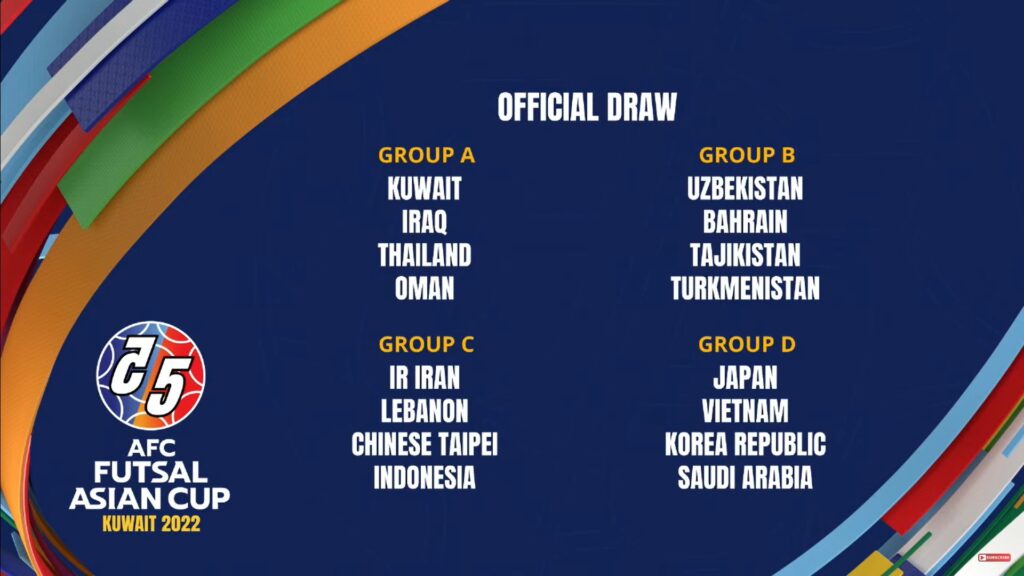26 พ.ค.65-สมาพันธ์ฟุตบอลแห่งเอเชีย หรือ เอเอฟซี จัดพิธีจับสลากการแข่งขันฟุตซอลชิงแชมป์เอเชีย 2022 ที่ประเทศคูเวต โดย ผลการจับสลากมีดังนี้