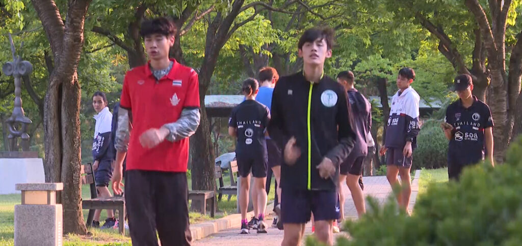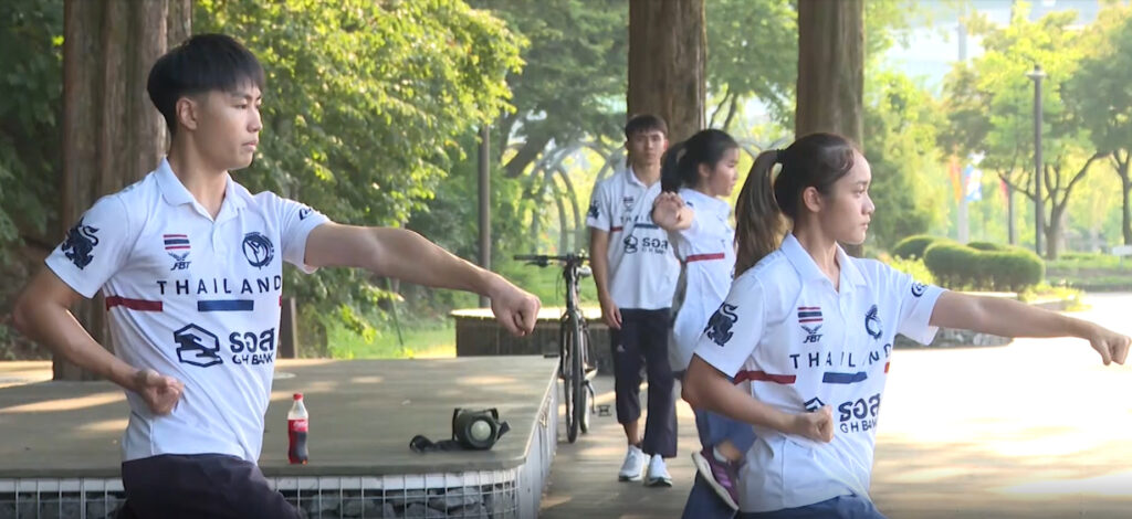 ส่วนทีมพุมเซ่ 5 คน ที่เพิ่งเดินทางถึงเกาหลีใต้ มีอาการอ่อนเพลียเล็กน้อย แต่ก็ลงมายืดเหยียดกล้ามเนื้อและทบทวนท่ารำ โดยใช้เวลาฝึกซ้อมประมาณ 1 ชั่วโมงครึ่ง พร้อมลงแข่งขันในวันพรุ่งนี้. – สำนักข่าวไทย