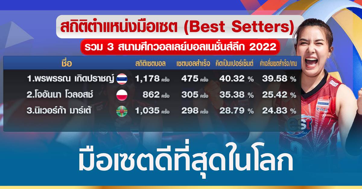 ขณะที่ “กัปตันชมพู่” พรพรรณ เกิดปราชญ์ มือเซตของไทย เป็นนักตบทำผลงานดีที่สุดในโลกในตำแหน่งมือเซต (Best Setters) มีสถิติเซตบอลสำเร็จ 475 ครั้ง คิดเป็น 40.32% จากทั้งหมด 1,178 ครั้ง และมีค่าเฉลี่ยเซตประสบความสำเร็จต่อเกมสูงถึง 39.58% เอาชนะ โจอันนา โวลอสช์ จากโปแลนด์ และ นิเวอร์กา มาร์เต้ จากโดมินิกัน และยังเป็นผู้เล่นจากเอเชียคนเดียวที่ทำสถิติดีที่สุดในทุกสถิติ .- สำนักข่าวไทย